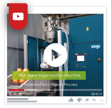 Este procedimiento patentado puede efectuarse con todo residuo de producción de caucho no contaminado. REP ha diseñado una máquina que utiliza este procedimiento.