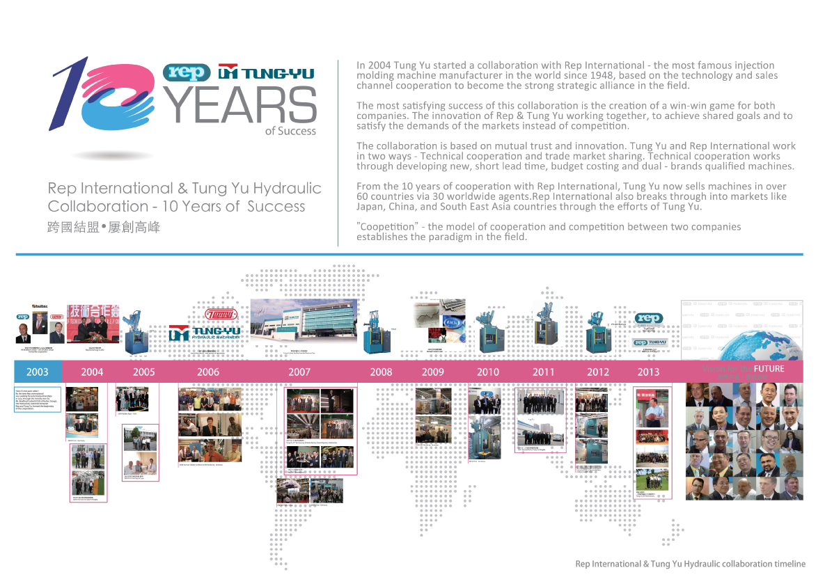 REP se convertía en agente comercial y posventa de la gama de inyectoras de compresión de Tung Yu para todo el mundo, salvo Asia. De esta forma, REP ofrece a sus clientes la posibilidad de acceder a los productos de Tung Yu a buen precio y con buena manufactura, con la garantía de contar con una red comercial y un servicio posventa de REP de proximidad.