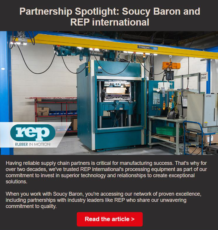 Soucy Baron: Utilizamos inyectoras de REP para el moldeo y sobremoldeo de diversas piezas de caucho. Estas últimas se destinan a múltiples sectores de actividad como vehículos automóviles, agricultura, industria, etc.